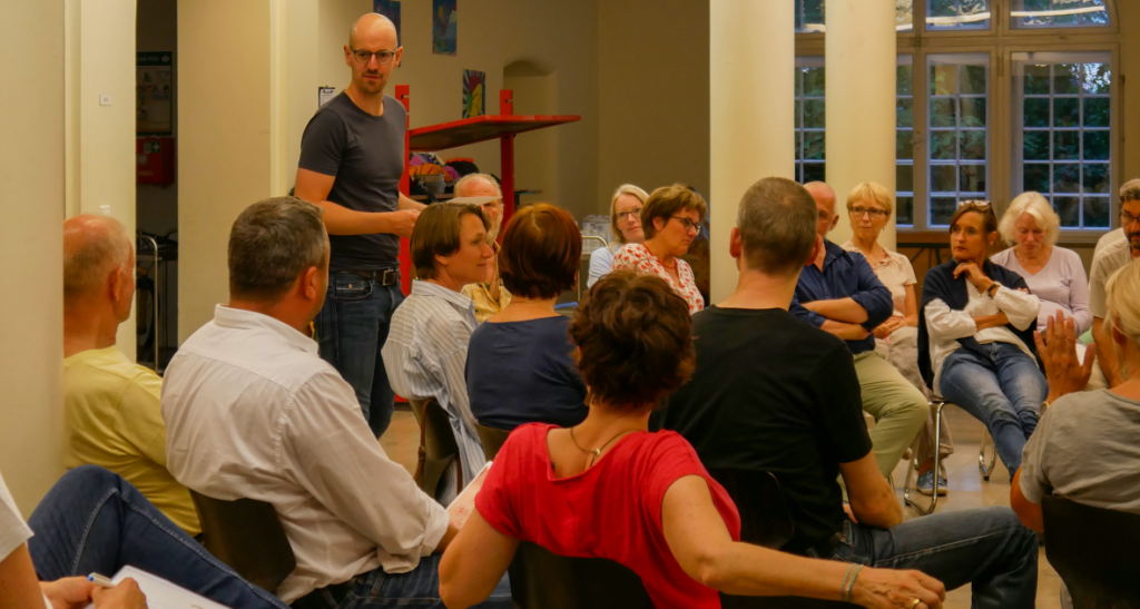 Jan erklärte die neue Organisationsstruktur. Seit Beginn unserer Arbeit hat sich einiges getan und der Endspurt Richtung Genossenschaftsgründung machte die Umstrukturierung unserer Arbeitsgruppen nötig.